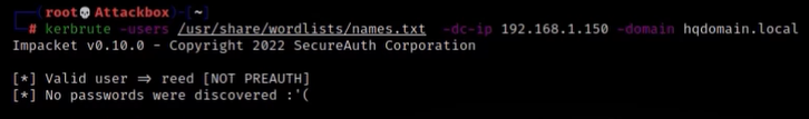 Enumerating users with kerbrute allows you to know which user accounts are on the target domain and which accounts could potentially be used to access the network. We discover a user account ‘reed’