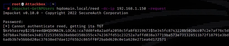 Kerberos pre-authentication shows disabled for account ‘reed’. Lets use Impackets GetNPUsers to grab the krbasrep5 hash and see if it can be cracked using the standard rockyou wordlist.