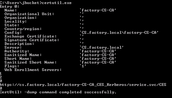 From WS.factory.local issuing the certutil.exe command identifies CS.factory.local as a ADCS