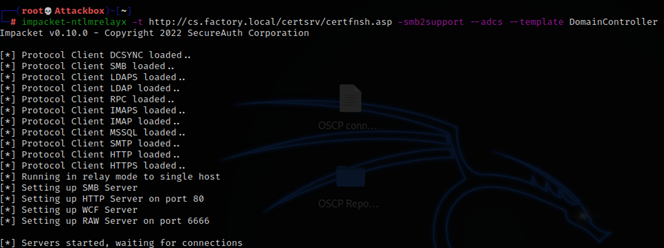 Next force the authentication from the DC to the NTLM relay on our attackbox. From ws.factory.local.