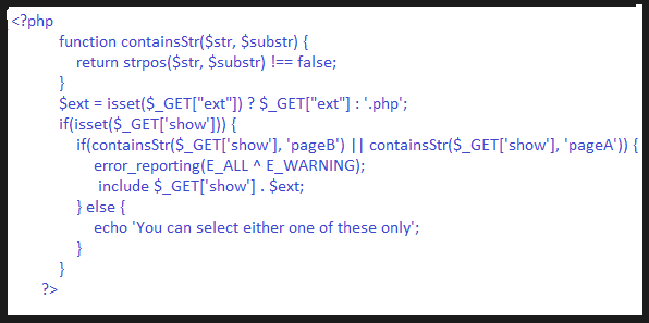 We can take advantage of this code to view backend php code from other pages of the website by passing the show=pageB string and defining the $_GET[“ext”] : ‘.php’; variable Which could revel useful information to a attacker.