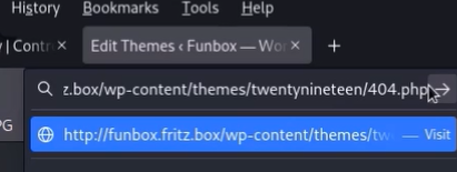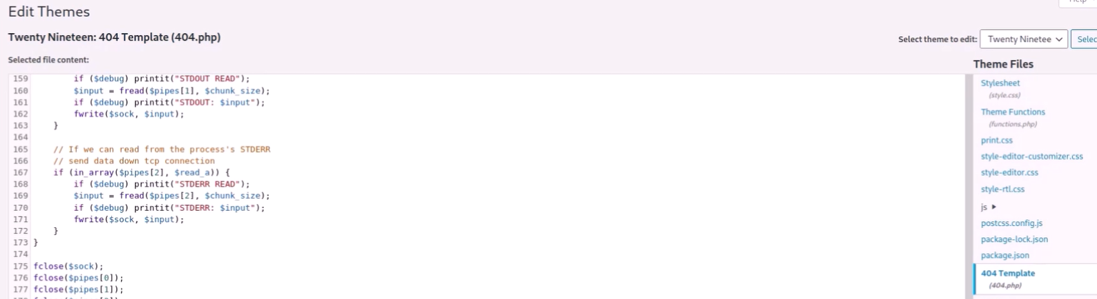 A tried and true method to gain a foothold to the hosting server is over writting a Theme File with a reverse PHP shell. Here we updates 404.php with php code pentestmonkey’s php-reverse-shell