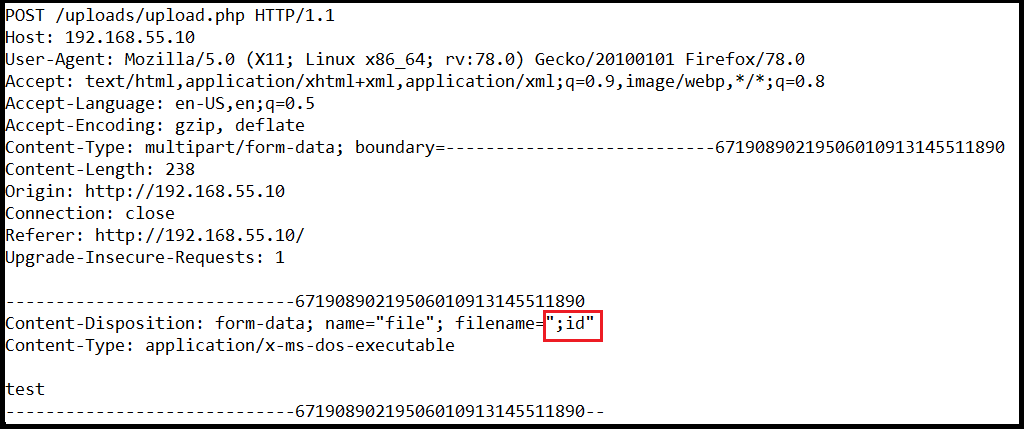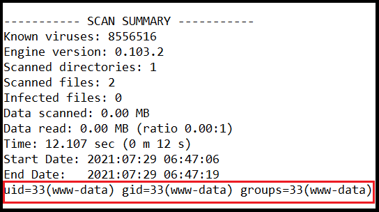 However any other file extension is uploaded such as test.txt it will complete the call to the system function that runs /usr/bin/clamscan and appends our filename to the command. If this request is captured we could change the $name variable to a system native command to check if OS command injection is possible.