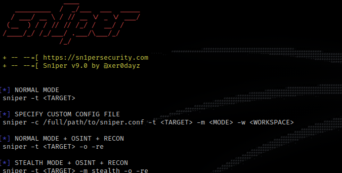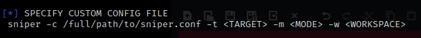 - To run this Specify: sniper -c /full/path/to/configfilename.conf -t thetargetdomain.com -m stealth -o -re